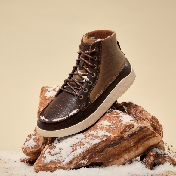 Premium, distressed, and waterproof leather upper contrasted with a waxed canvas back quarter panel delivers a casual and rugged look. Lined in a recycled microfiber that offers a nice, soft and comfortable feeling against the foot.