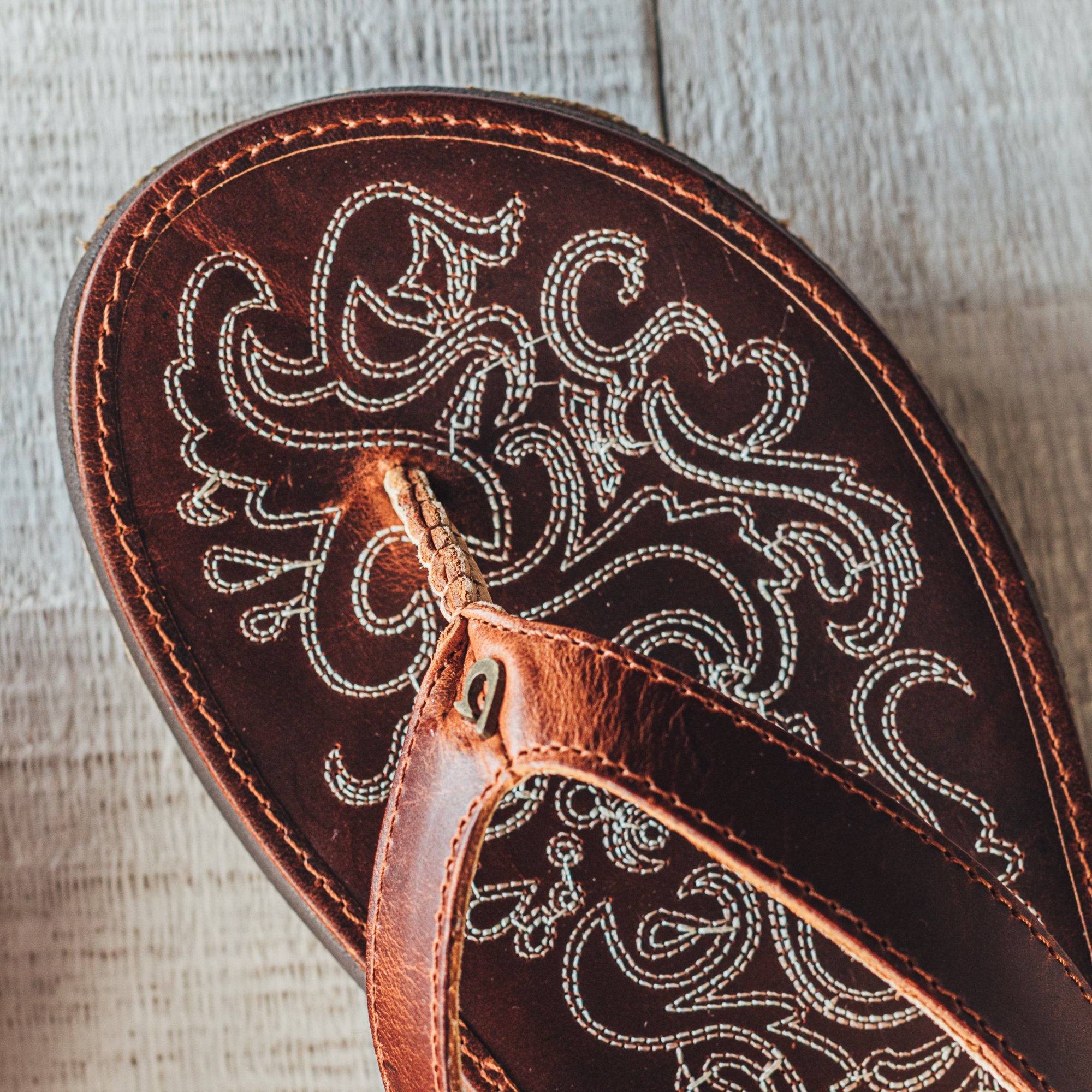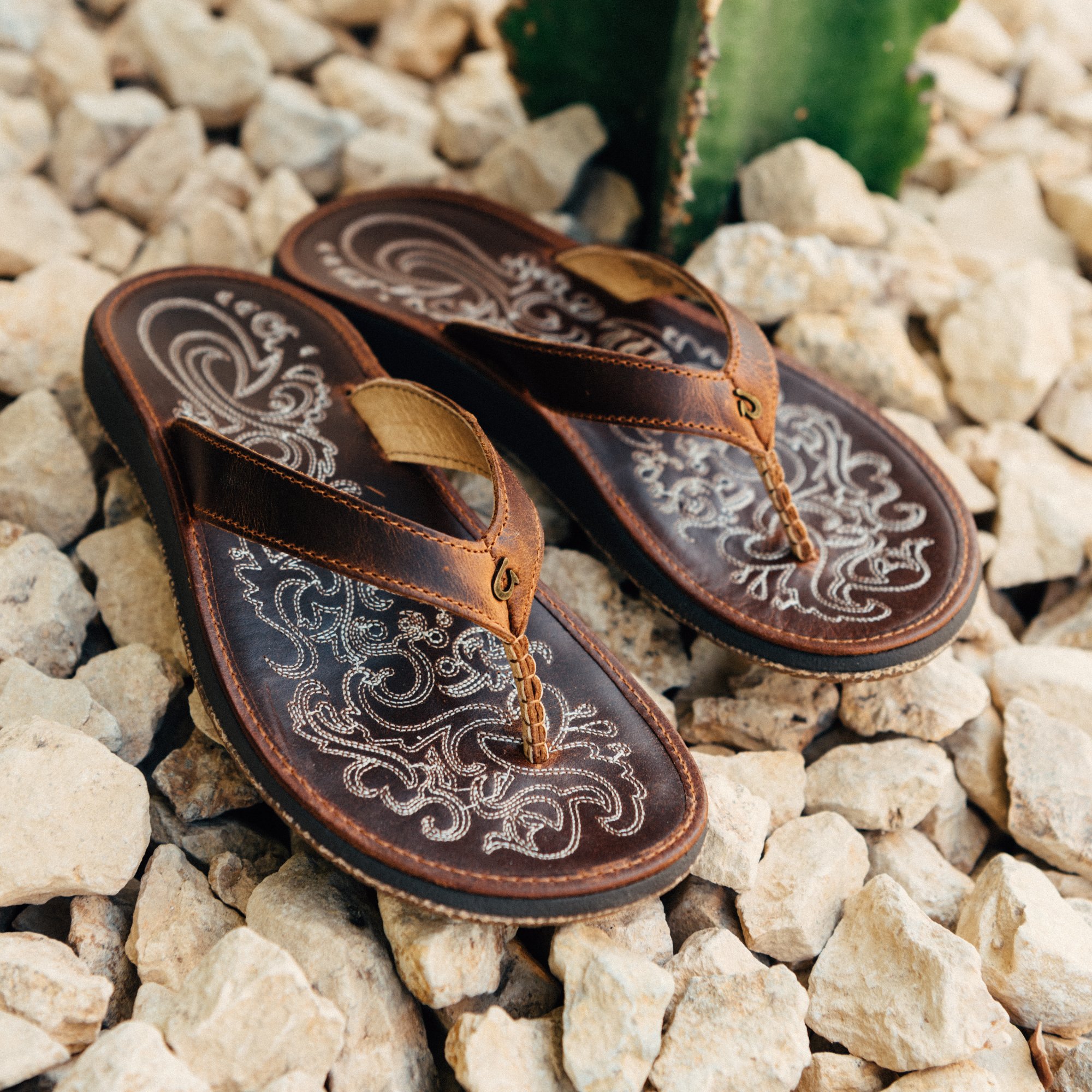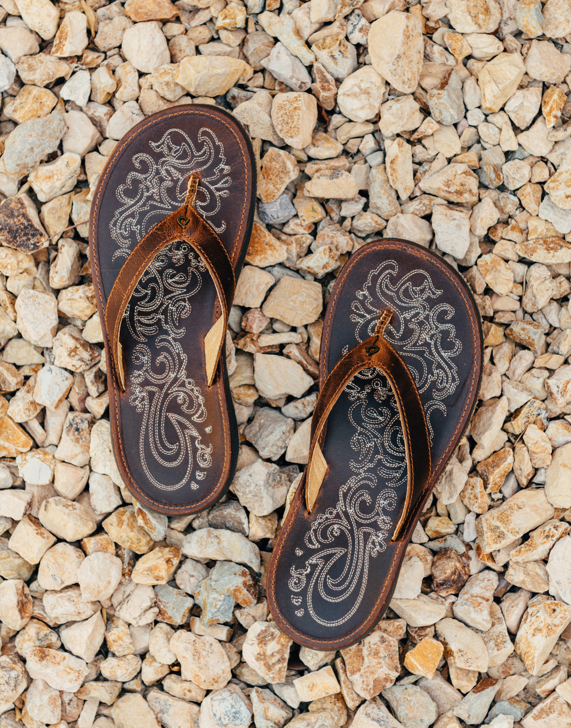 In 1833, Mexican vaqueros taught Hawaiians how to manage cattle. Since then, the paniolo (cowboy) culture has thrived in Hawai‘i, especially on Maui and the Big Island, where it remains vibrant today. Our Paniolo sandal taps in that timeless upcountry aesthetic and sense of adventure with its embroidered footbed artwork inspired by saddle-stitch detailing.